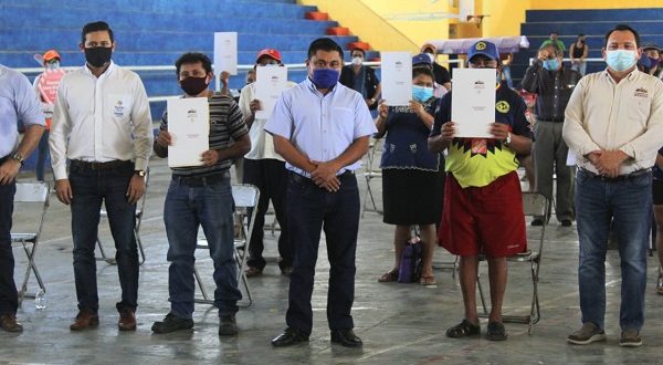 Siguiendo con las medidas de prevención del COVID-19, el alcalde de Umán, Freddy Ruz Guzmán junto a la delegada estatal del Registro Agrario Nacional, Dalia Isela Piña Alberto, el coordinador de los Programas de Desarrollo del Gobierno Federal en Yucatán, Joaquín Díaz Mena y la directora de Promoción y Participación Social de la Secretaría de Desarrollo Social, Marissa Aurora Salazar Azcorra, hizo la entrega de 84 certificados de títulos de propiedad a ejidatarios del municipio, quienes ya contarán con un patrimonio seguro.