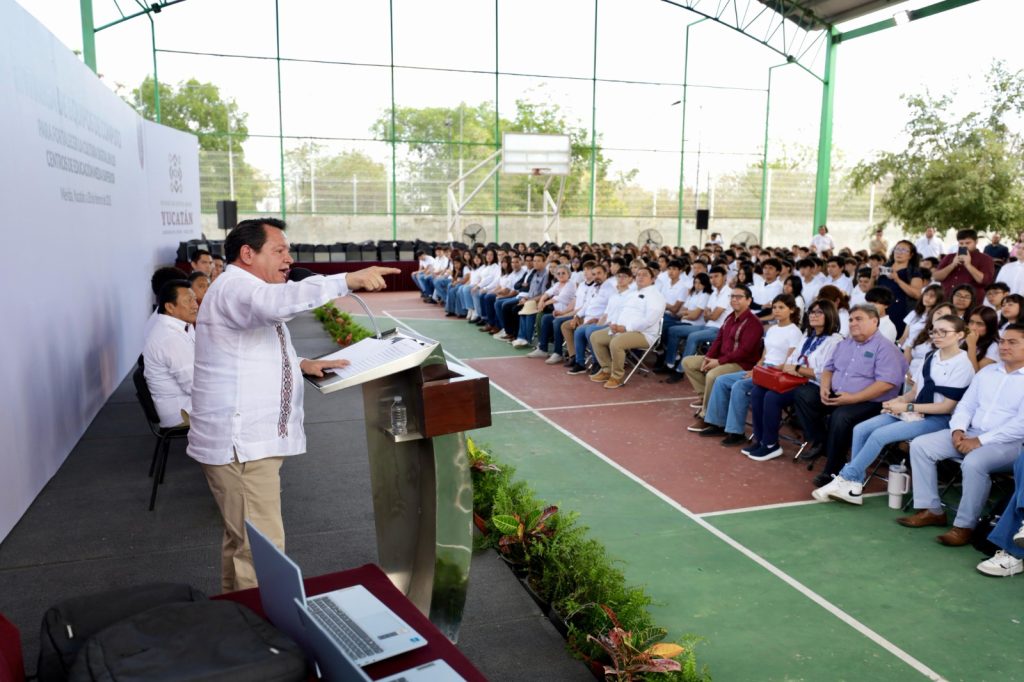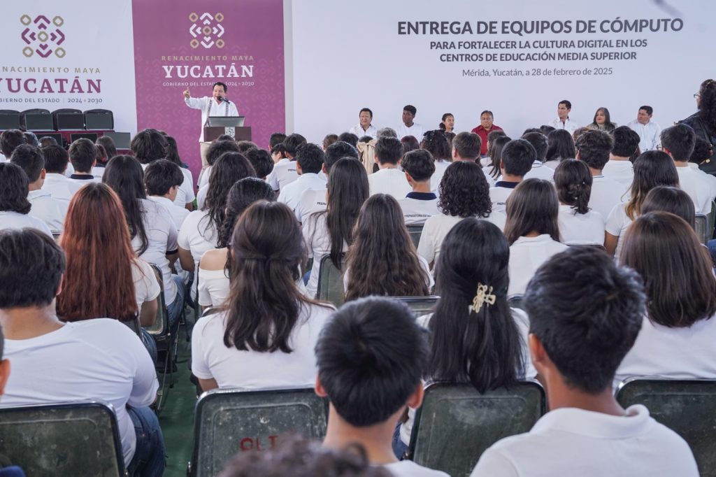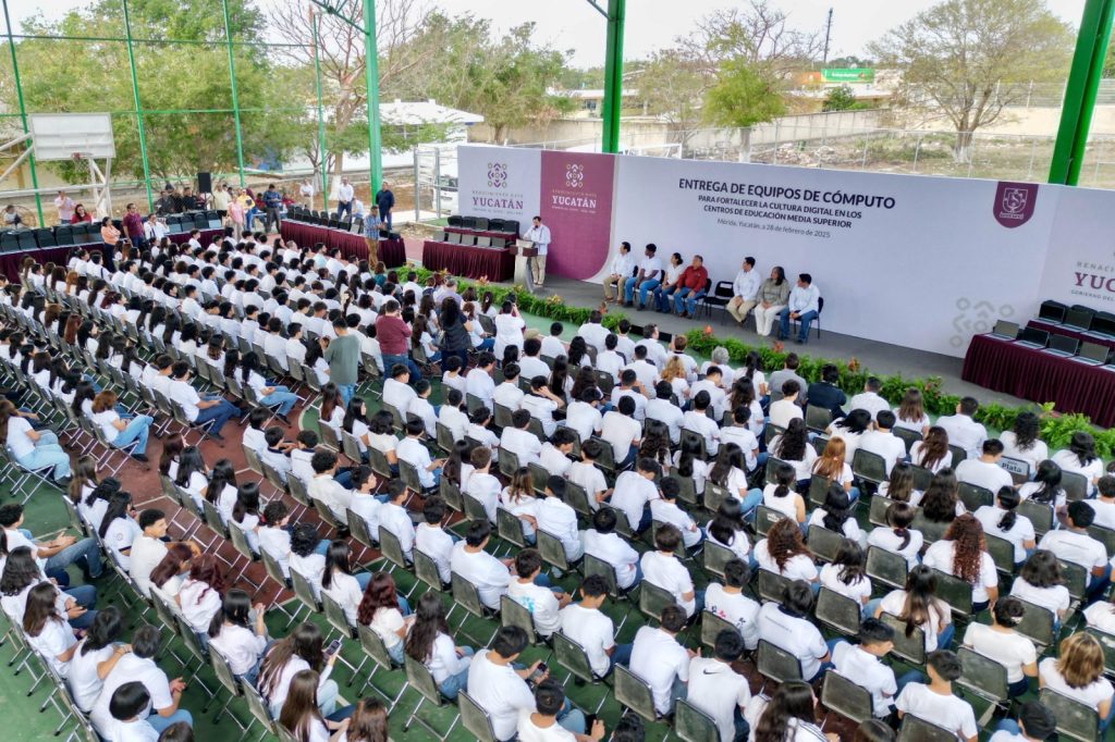 Mérida, Yucatán, a 28 de febrero de 2025.- Como parte de los esfuerzos para fortalecer la cultura digital en los centros de educación de nivel medio superior, el Gobernador Joaquín Díaz Mena entregó más de 400 equipos de cómputo a preparatorias estatales de Yucatán, con el fin de que cuenten con las herramientas necesarias para brindar una enseñanza de calidad e igualdad de oportunidades a las y los jóvenes yucatecos.