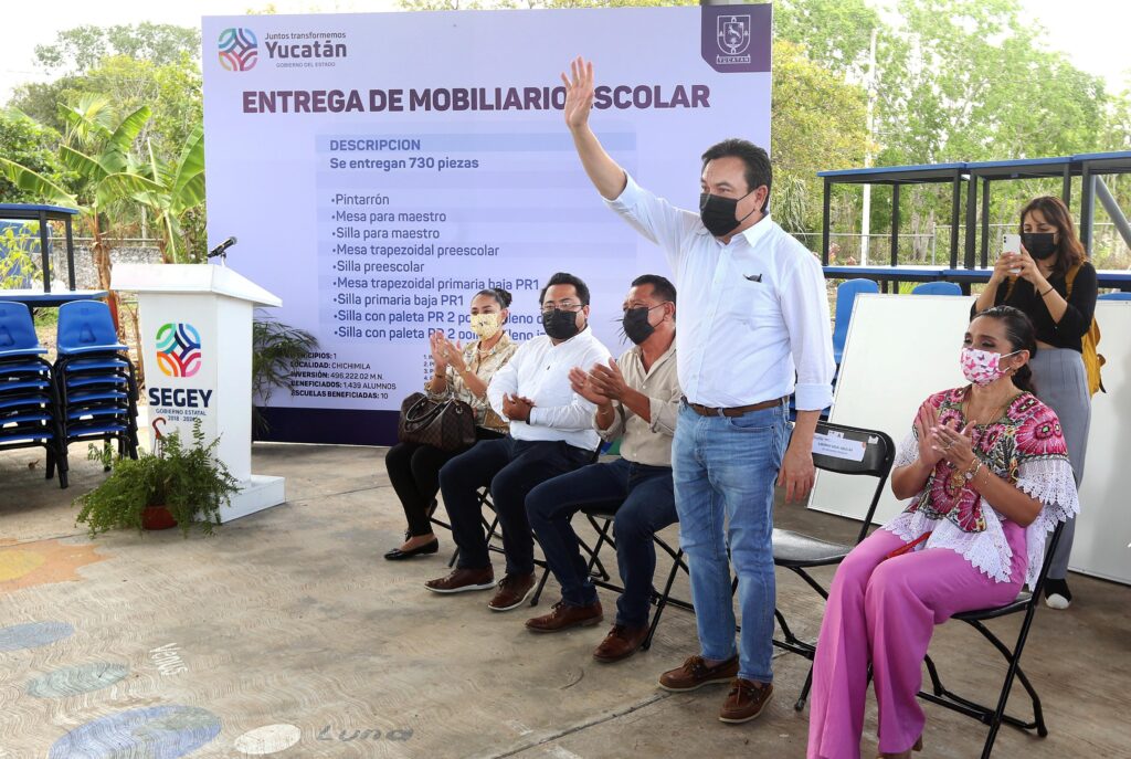 Chichimilá, Yucatán, a 4 de junio de 2022.- Con el objetivo de generar mejores condiciones para el acceso a la Educación, tal como lo instruye el gobernador Mauricio Vila, el titular de la Secretaría de Educación estatal, Liborio Vidal Aguilar, encabezó la entrega de mobiliario escolar para 10 escuelas de nivel básico del municipio de Chichimilá.