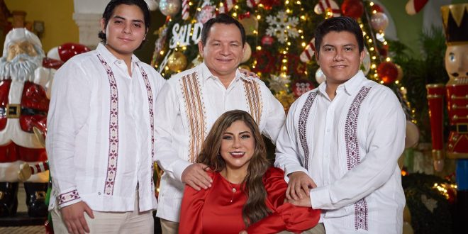Mérida, Yucatán, a 24 de diciembre de 2024.- El Gobernador de Yucatán, Joaquín Díaz Mena, acompañado de su esposa, la maestra Wendy Méndez Naal y sus hijos, Julián y Joaquín, transmitió un emotivo mensaje navideño a las y los habitantes de Yucatán, destacando la importancia de la unidad familiar y la paz en estas fechas.