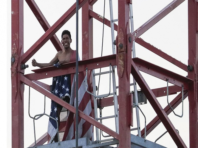 El sujeto fue captado a 60 metros del suelo sobre una grúa de construcción, mientras portaba una bandera de Estados Unidos la cual cubría su -al parecer- desnudo cuerpo.