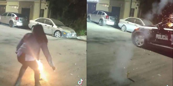 Es entonces cuando una mujer enciende uno de estos artefactos que sale disparado al aire y de repente cambia de dirección y cae sobre una patrulla policiaca que justo transitaba por el lugar.