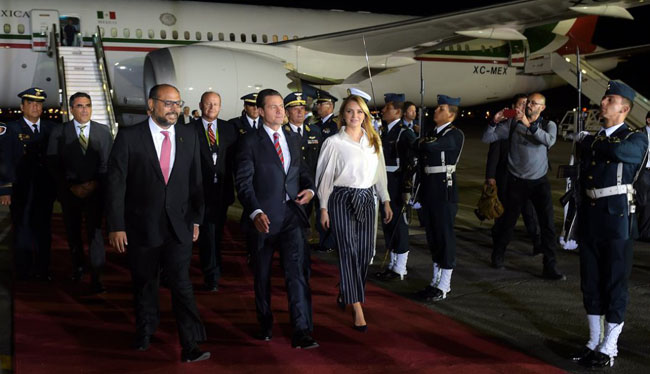 Después de cinco horas de vuelo, el primer mandatario arribó al aeropuerto internacional Jorge Chávez de la ciudad de Lima, a las 00:30 horas, a bordo del avión presidencial TP-01, acompañado por su esposa, Angélica Rivera de Peña, y los secretarios de Relaciones Exteriores, Luis Videgaray, y de Economía, Ildefonso Guajardo, entre otros funcionarios.