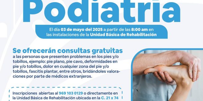 Progreso, Yucatán, a 22 de abril de 2025.– El Sistema para el Desarrollo Integral de la Familia (DIF) Municipal, a través de la Unidad Básica de Rehabilitación (UBR), invita a la ciudadanía a participar en el programa de podiatría, dirigido a quienes requieren atención especializada para el cuidado de los pies.