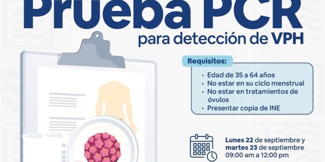 Progreso, Yucatán, a 22 de septiembre de 2025.- Este lunes 22 y martes 23, el Ayuntamiento de Progreso, a través de la Dirección de Salud y en coordinación con el Centro de Salud y Servicios Ampliados (CESSA), realizará pruebas gratuitas de PCR para la detección del Virus del Papiloma Humano (VPH). La atención será de 9:00 a.m. a 12:00 p.m. en las instalaciones de la dependencia municipal.