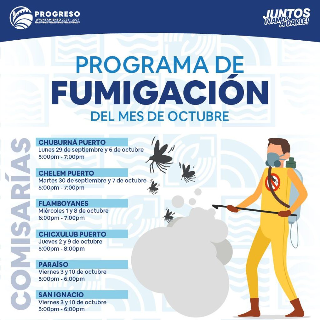 Progreso, Yucatán, a 1 de octubre de 2025.-A través de la Dirección de Servicios Públicos, el Ayuntamiento de Progreso refuerza durante octubre las acciones de fumigación en la cabecera municipal y en las seis comisarías, con el objetivo de proteger la salud de las familias y prevenir la proliferación de mosquitos.