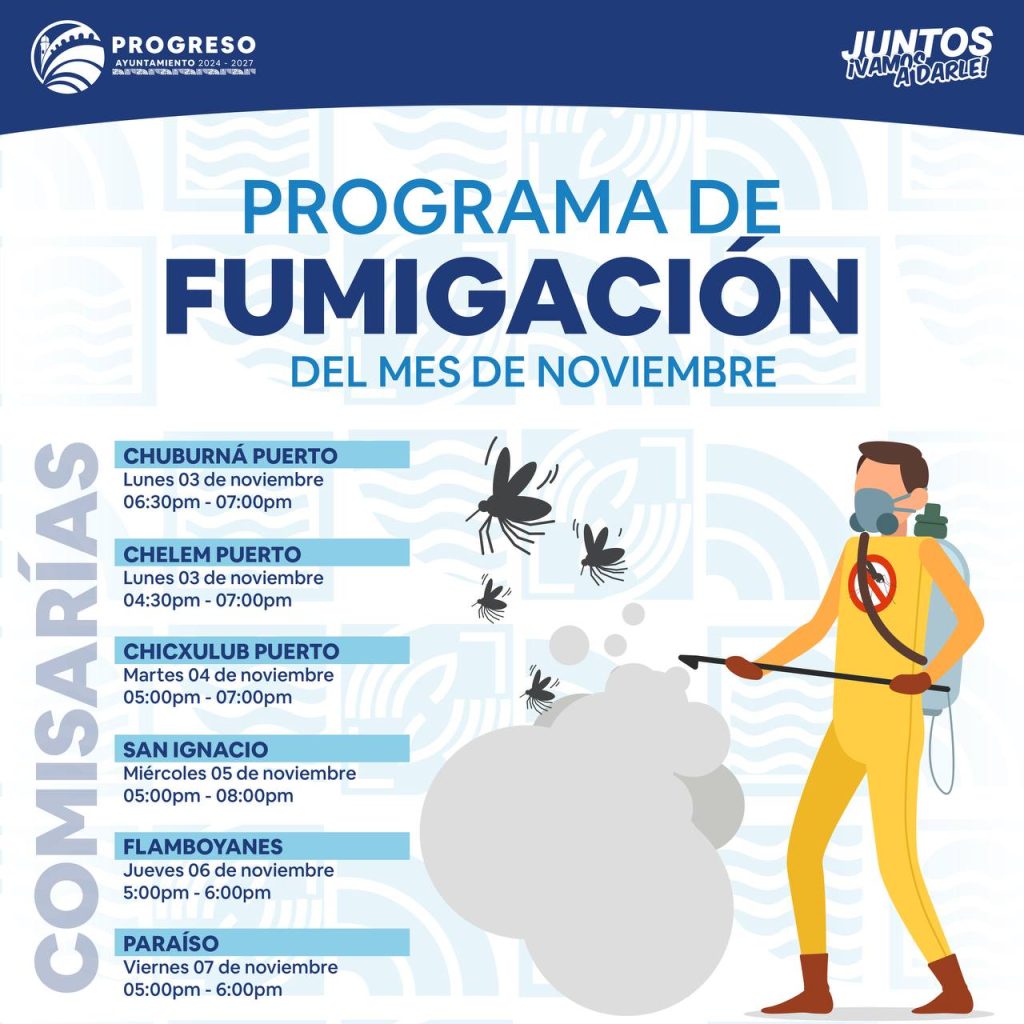 Para conocer actualizaciones del calendario de fumigación y próximas campañas, se invita a consultar las redes oficiales del Ayuntamiento de Progreso.