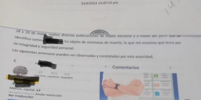 El 29 de mayo, en otra publicación de Rihani González, que para esas fechas cerraba su campaña, el mismo sujeto le lanzó otra amenaza: “plomazo en la frente por sedicioso de Mierda. Quiero ver hijo de perra (sic)”, en el que incluye también imágenes de una pistola y otra de una bandera de México.