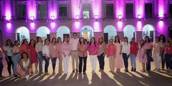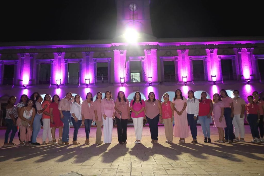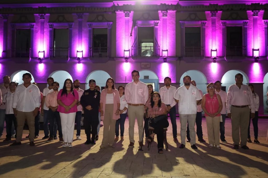 Progreso, Yucatán a 05 de octubre de 2024. El alcalde, Ing. Erik José Rihani González y autoridades municipales presenciaron esta noche la iluminación en color rosa de la fachada del Palacio Municipal, esto como símbolo de solidaridad y de sensibilización sobre el cáncer de mama.