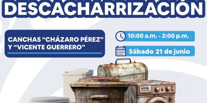 El módulo de descacharrización estará disponible este sábado 21 de junio, en un horario de 10:00 a.m. a 2:00 p.m., en dos puntos estratégicos: la cancha “Cházaro Pérez” (calle 33 entre 62) y la cancha “Vicente Guerrero” (calle 37 entre 114 y 112).