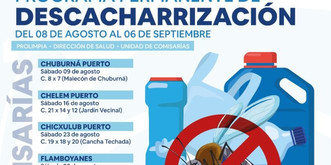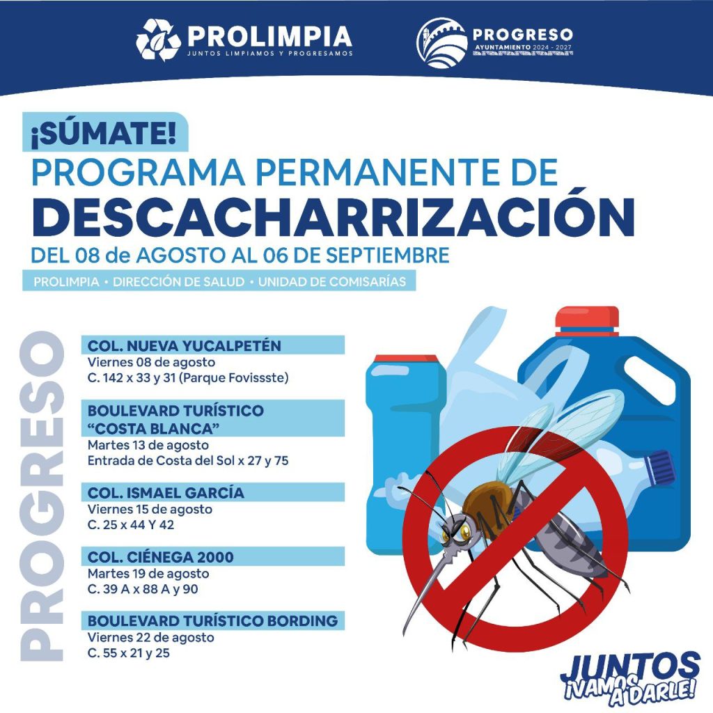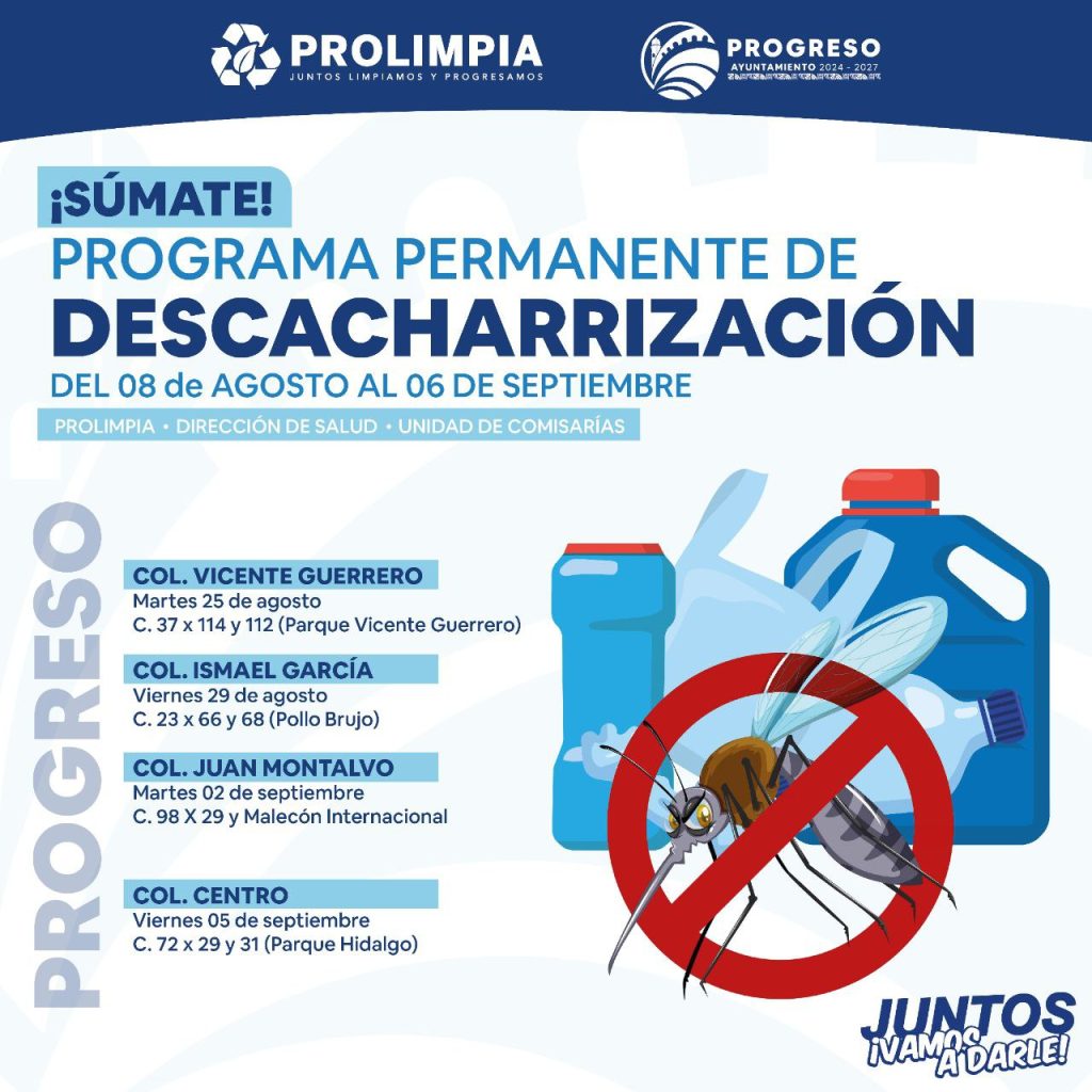 Progreso, Yucatán, a 11 de agosto de 2025.-Con el objetivo de prevenir la reproducción de insectos transmisores de enfermedades y facilitar a la ciudadanía puntos de recolección de cacharros, el alcalde Erik Rihani, a través de la Dirección de Gestión Integral de Residuos Sólidos Prolimpia, puso en marcha ayer sábado, en la comisaría de Chuburná, la segunda etapa del Programa Permanente de Descacharrización.