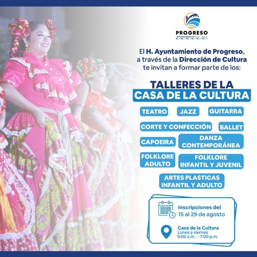 Progreso, Yucatán, 15 de agosto de 2025.-Por instrucciones del alcalde Erik Rihani González, a partir de este viernes y hasta el 29 de agosto, la Dirección de Cultura del Ayuntamiento de Progreso mantendrá abiertas las inscripciones para que niños, jóvenes y adultos participen en alguno de los diez talleres gratuitos que ofrece, con el objetivo de impulsar el talento local y fortalecer el tejido social.