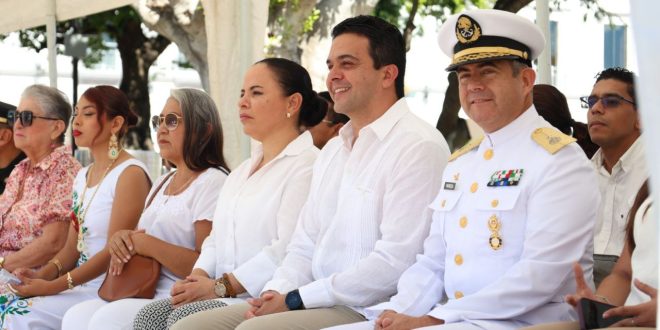 Progreso, Yucatán, 13 de septiembre de 2025.-A través de una ceremonia cívica realizada en el Obelisco en memoria de los Niños Héroes, el alcalde Erik Rihani González, acompañado de la secretaria de Pesca y Acuacultura Sustentable (SEPASY), Lila Frías Castillo, en representación del Gobernador del Estado, conmemoró esta mañana el 178 aniversario de la Gesta Heroica de Chapultepec.