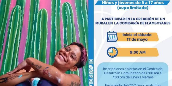 El taller de murales “Alas y raíces: arte, color y movimiento” está dirigido a jóvenes de entre 9 y 17 años, y busca ofrecerles nuevas formas de expresión y distracción positiva. La primera sesión se llevará a cabo este sábado 17 de mayo en la comisaría de Flamboyanes.