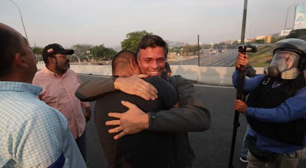 Leopoldo López, que estaba bajo arresto domiciliario, fue liberado el martes 30 de abril por un grupo de militares y funcionarios del Servicio Bolivariano de Inteligencia Nacional (Sebin) que se habían unido al jefe del Parlamento, Juan Guaidó, reconocido por 54 países como presidente interino.
