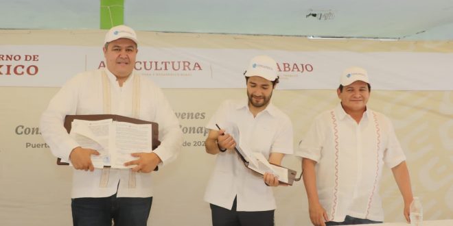 La firma del convenio se realizó en la comunidad de Puerto Río Lagartos, Yucatán, con la asistencia del Comisionado Nacional de Acuacultura y Pesca, Octavio Almada Palafox, y el Subsecretario de Empleo y Productividad Laboral y responsable del programa Jóvenes Construyendo el Futuro, Marath Bolaños López. Atestiguó el acto la alcaldesa Floricely Alcocer Marfil.
