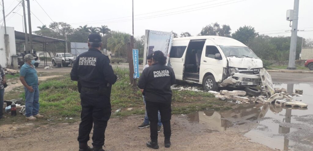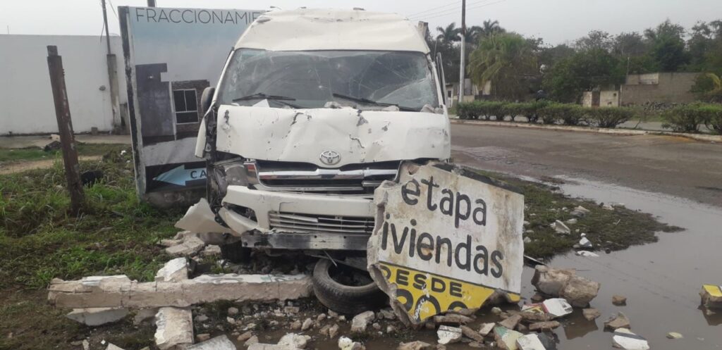 En el otro percance, una combi con trabajadores de la construcción, que procedía de Timucuy y se dirigía a Conkal, se quedó sin frenos y se salió del camino, estampándose contra una barda.