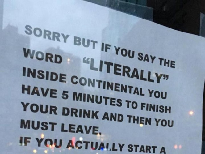 Lo siento, pero si dices la palabra ‘literal’ dentro del Continental tienes 5 minutos para terminarte tu bebida e irte”, dice el letrero. “¡Si empiezas una oración con ‘yo literal…’, debes irte inmediatamente!”.