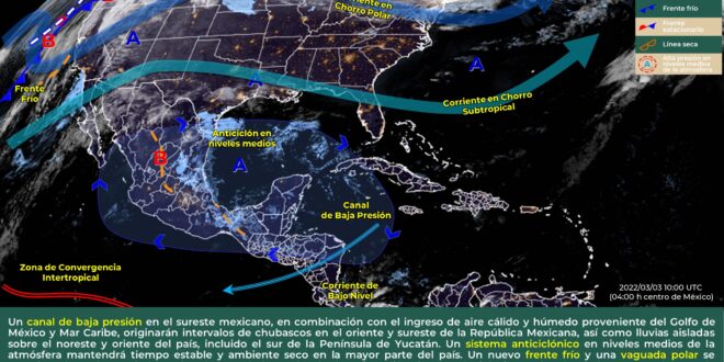 MÉRIDA, Yuc., 03 de marzo 2022.- En las próximas 24 horas, se prevé cielo despejado a parcialmente nublado, con probabilidad para lloviznas aisladas. Temperaturas cálido a caluroso en el día y templado a cálido al amanecer.