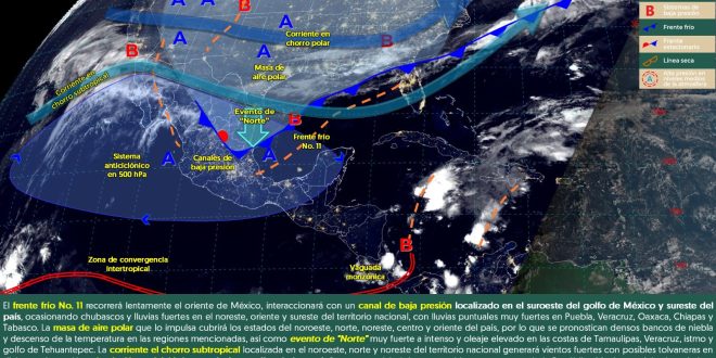 La aproximación del frente frío núm. 11, estará induciendo una vaguada al occidente de la península, por lo que se prevén lluvias aisladas en el sur de