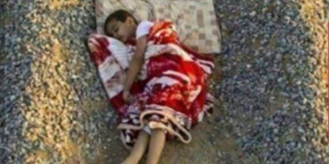 Ésto es Siria, una Siria martirizada por el imperialismo, sus bombardeos y sus mercenarios: un niño duerme entre sus padres enterrados”, afirma una publicación compartida más de 8.600 veces en Facebook desde el 28 de febrero de 2018, y que va acompañada de la foto de un niño que parece estar durmiendo sobre dos montículos de tierra.