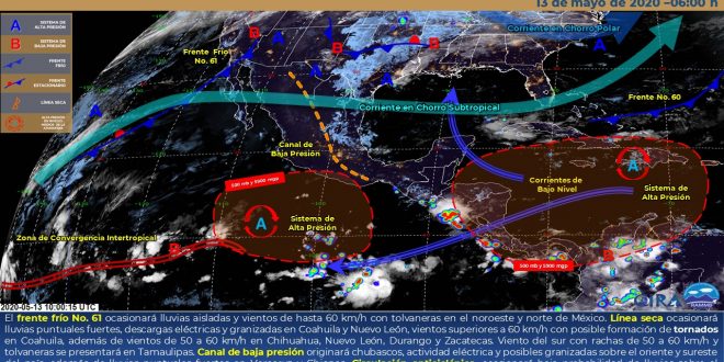 MÉRIDA, Yuc., 13 de mayo 2020.- En las próximas 24 horas, se prevé cielo medio nublado a nublado con probabilidad para intervalos de chubascos con tormentas, con temperaturas de calurosas a muy calurosas durante el día y cálidas al amanecer.