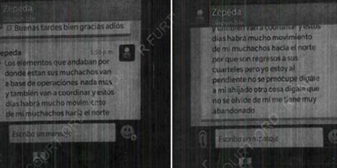 “Los elementos andaban por donde están sus muchachos. Van a [la] base de operaciones nada más y también van a coordinar. Estos días habrá mucho movimiento de mis muchachos hacia el norte. […] Pero yo estoy al pendiente, no se preocupe. Dígale a mi ahijado que no se olvide de mí”, se lee en los presuntos mensajes de Salvador Cienfuegos Zepeda.