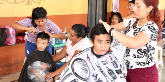 Mérida Yucatán a 15 de mayo de 2023.- Estudiantes de la Escuela de Artes y Oficios “Luciana Kan viuda de Luna”, perteneciente a la Secretaría de Educación del Gobierno del Estado, pusieron sus conocimientos y habilidades al servicio de la comunidad, con cortes de cabello a niñas, niños y adultos de la comisaría de Sierra Papacal.