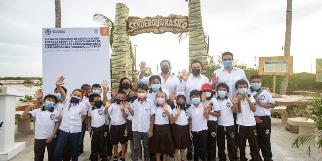 Progreso, Yucatán, a 12 de julio del 2022.- Con el propósito de que alumnas y alumnos de nivel básico puedan disfrutar y aprender en el Sendero Jurásico de Chicxulub Puerto, la Secretaría de Educación del Gobierno del Estado de Yucatán y el Ayuntamiento de Progreso, firmaron un acuerdo de coordinación para realizar visitas escolares a este lugar recreativo y de divulgación científica.