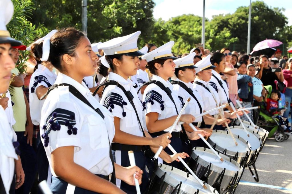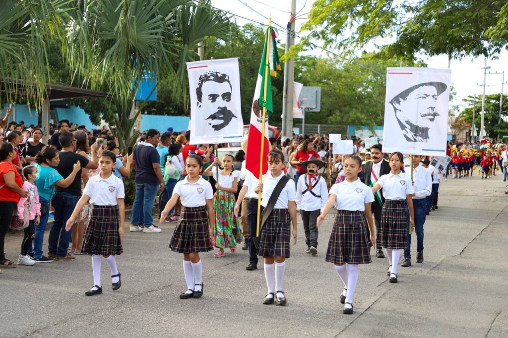 El desfile estuvo integrado por las escuelas primarias “Alfredo Lizarraga Azarcoya”, “Ana Sofía Baeza García” y “Carlos Carrillo Vega”, en sus dos turnos; así como la destacada participación de la Banda de Guerra de la Preparatoria Estatal número 10 “Rubén Rodríguez Moguel”, quienes dieron inicio al colorido derrotero.