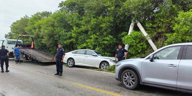 Pero al estar el piso mojado, perdió el control y se salió del camino hasta impactarse de lleno contra un poste de la CFE.
