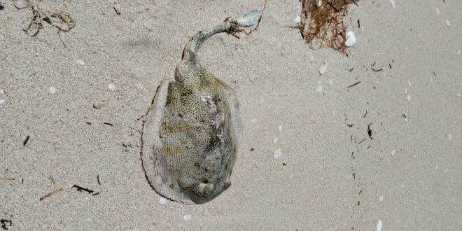 PROGRESO, Yuc., 08 de agosto 2022.- Autoridades municipales de Progreso, hicieron un llamado a la ciudadanía de evitar ingresar al mar ya que el día de hoy se detectaron especies marinas tales como; Rayas o Guitarras (Rhinobatidae) y Pez globo (Spheroides splengleri), que vienen estresadas a causa de la Marea Roja que se está acercando a la costa.