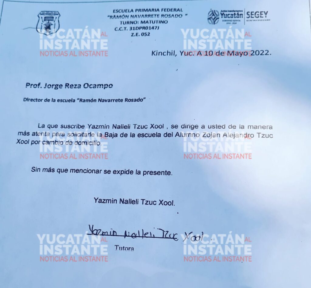 Yazmín señaló que el pasado jueves cuando fue por la salida de su vástago de 8 años, ya tenía una lesión en la nariz, pidiendo una explicación a los maestros de que fue lo que sucedió. Incluso ese mismo día tuvo que llevar a consultar, pues por poco resulta con una fisura el menor, quien dijo que un compañerito le pego. Asimismo este martes, con la solicitud en mano se pudo entrevistar con la supervisora de la Zona Escolar 052, a la cual según ella identifico como Diana Balam Fernández y le explicó la serie de agresiones físicas que ha tenido su retoño durante todo este ciclo. A pesar de que esperaba que le acepten la baja para traspasar a otro colegio que ubica en el centro de esta localidad, fue en vano, le negaron dicha petición. “Ya es mucho, solo pido que cambien a mi hijo de primaria, son varias veces que le pegan o le hacen maldad por diferentes niños” finalizó.