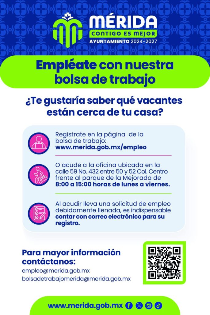 Para conocer más opciones de empleo, los interesados pueden acudir a la Dirección de Prosperidad y Bienestar Económico, ubicada en la calle 59 por 50 y 52 del Centro, frente al parque de la Mejorada,  de lunes a viernes de 8 de la mañana a 3 de la tarde.
