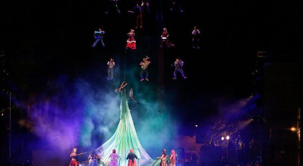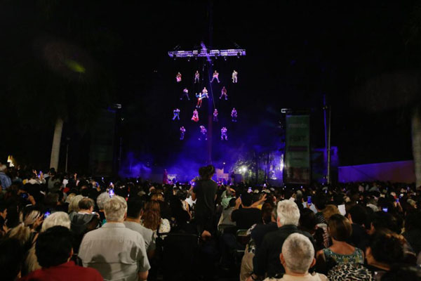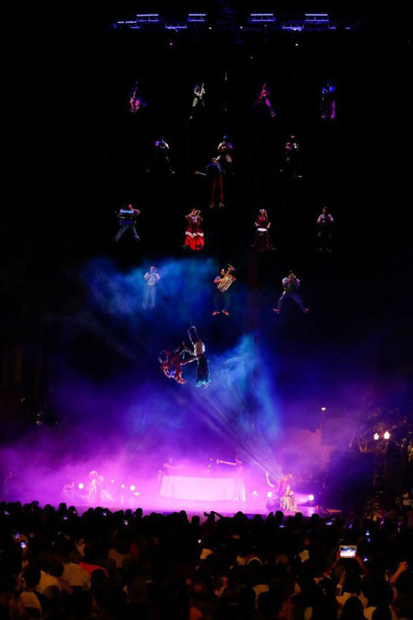 Durante 30 minutos el Presidente Municipal y los asistentes, disfrutaron de un espectáculo en el que 15 músicos con trompetas, saxofones, trombones, percusiones, una tuba y una guitarra, estuvieron suspendidos a una altura de 25 metros con una grúa mientras nueve mujeres actrices y bailarinas, así como acróbatas, hicieron gala de sus movimientos sobre el escenario.