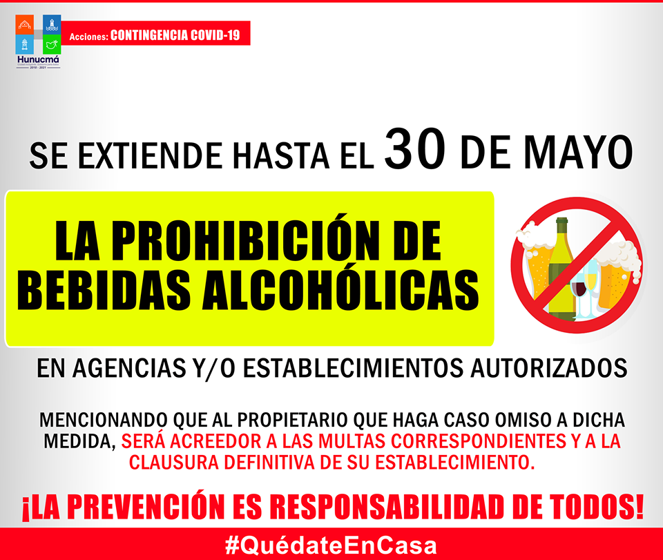HUNUCMÁ, Yuc., 29 de abril 2020.- Esta tarde el Ayuntamiento de Hunucmá anunció que unas de las medidas que se implementará como prevención en el municipio ante el Coronavirus Covid-19, será la ampliación de la Ley Seca hasta el 30 de mayo.