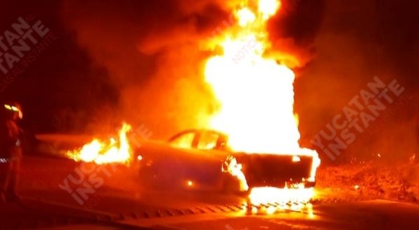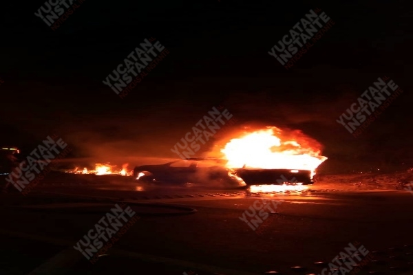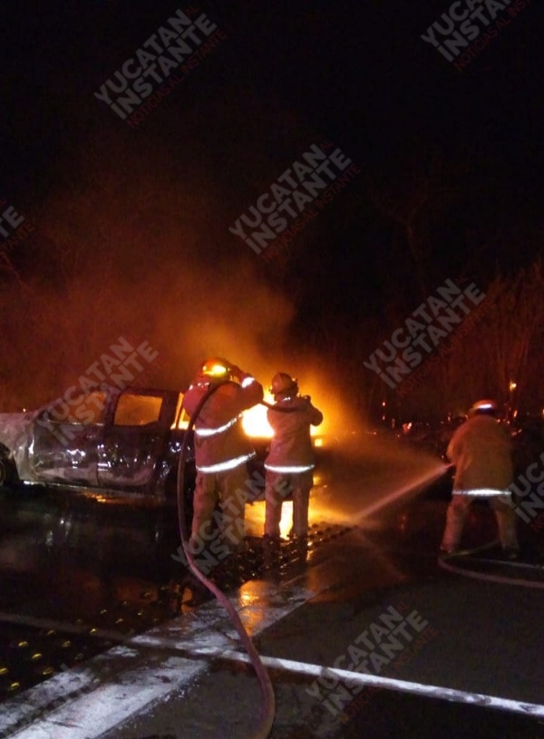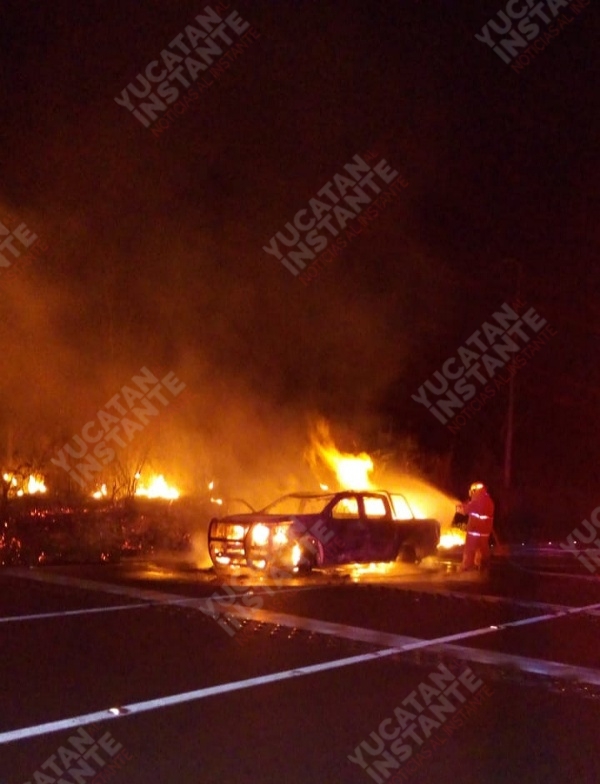 Valladolid, Yuc., 5 de mayo 2020.- Una camioneta de la Policía Municipal de Chankom ardió la noche de ayer, debido a una falla mecánica en la vía que comunica Chankom con Valladolid.