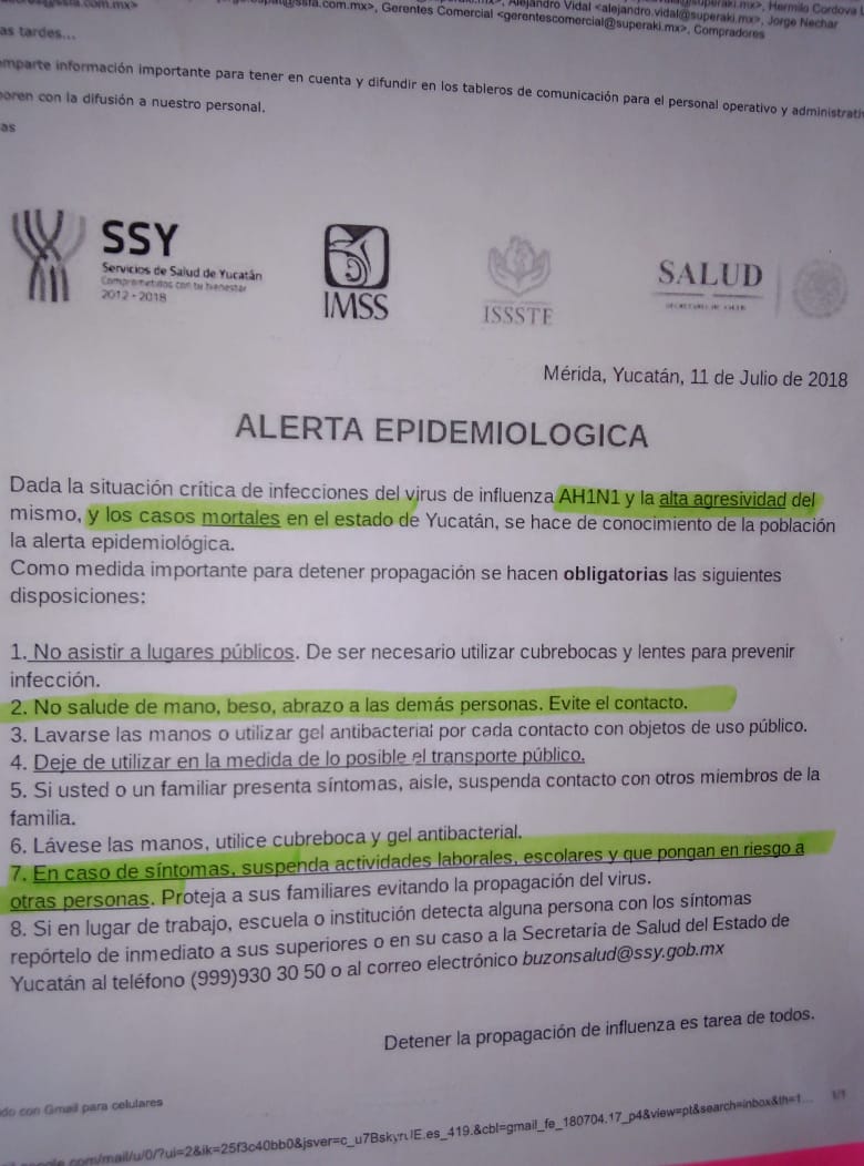 Mérida, Yucatán a 13 de julio. Luego de que ayer se difundiera en redes sociales, correos electrónicos y por WhatsApp el levantamiento de la “Alerta Epidemiológica” por el brote de influenza en Yucatán, la Secretaria de Salud de Yucatán (SSY), desmintió tal y dijo que no hay fundamentos para levantar esa alerta.