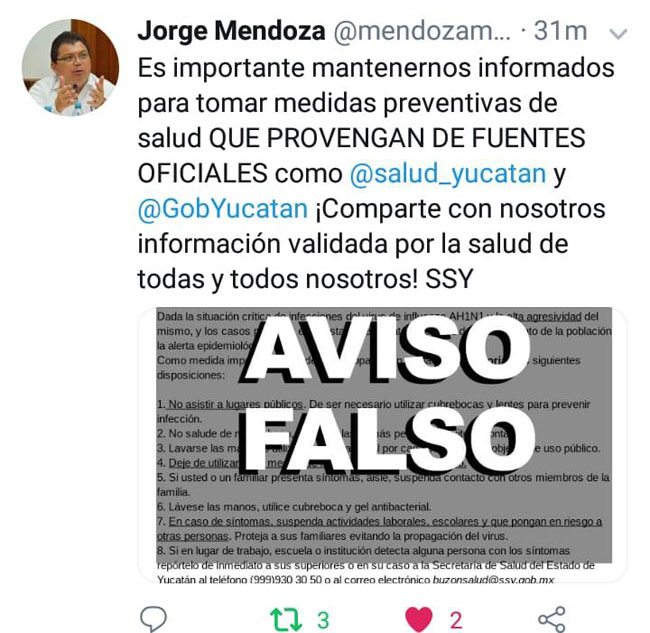 La propagación de esta alerta se dio con documentos y correos electrónicos que hacían alusión a las cuentas oficiales del sector salud por lo que al llegar a los oídos de autoridades estatales, rápidamente desmintieron tal levantamiento de alerta y asegurando que es falso el supuesto comunicado de los Servicios de Salud de Yucatán, IMSS, Issste y Secretaría de Salud federal en el cual se habla de una “Alerta epidemiológica” por el brote de influenza.