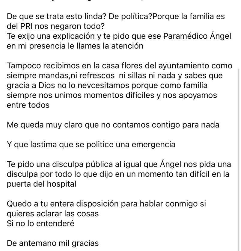Asimismo, en su mensaje público, acusaron al paramédico de realizar comentarios de carácter político durante el traslado, en referencia a administraciones municipales anteriores y a personas cercanas a la familia.
