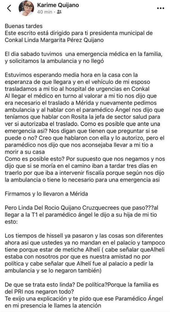 CONKAL, Yuc., 31 de marzo 2026.- Una familia del municipio de Conkal denunció públicamente a la presidenta municipal, Linda Pérez Quijano, por presuntamente haber negado el servicio de ambulancia durante una emergencia médica, lo que —afirman— derivó en el fallecimiento de un enfermero en estado crítico.