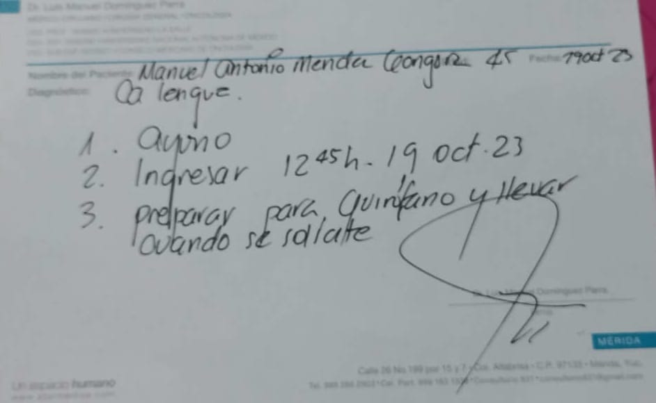 De acuerdo con la señora Elsy María, desde el mes de agosto su esposo, Manuel Méndez Góngora, comenzó a sentirse mal y pese a que acudió en varias ocasiones al IMSS para su tratamiento, ahí lo atendieron pero lo mandaron al dentista donde sólo le recetaron ampicilina