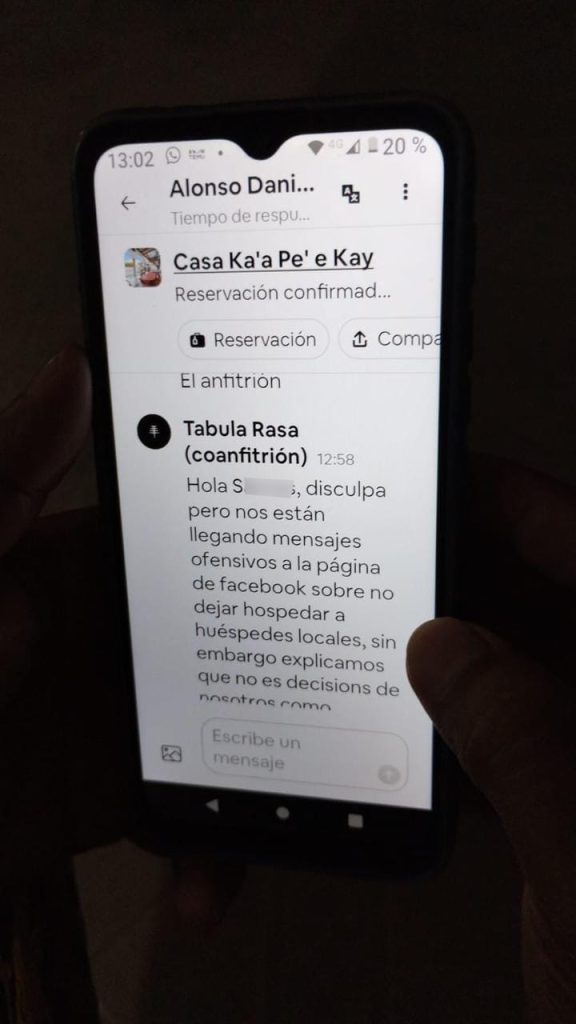 “Me da mucho coraje. Mi papá rentó una casa en la aplicación Airbnb lo cual era para festejar mi cumpleaños el 30 de septiembre. Mi papá pagó completo, sin embargo, el anfitrión le mandó mensaje diciendo que no aceptan a personas locales (yucatecos), me da mucho coraje porque en la aplicación no dice nada que no aceptan personales locales. Lo que más me molesta es que le dijo que él lo cancelé cuando mi papá pues no se esperaba que le dijera eso, porque mi papá ha rentado muchas veces y nunca la había pasado. Siento que mi familia fue discriminada por no ser turista”, mencionó la afectada.