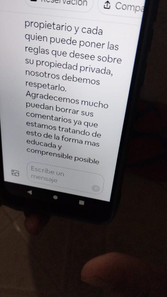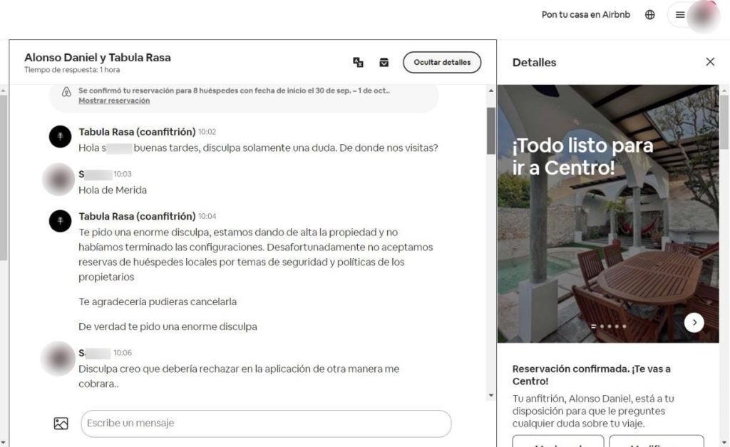 “Me da mucho coraje. Mi papá rentó una casa en la aplicación Airbnb lo cual era para festejar mi cumpleaños el 30 de septiembre. Mi papá pagó completo, sin embargo, el anfitrión le mandó mensaje diciendo que no aceptan a personas locales (yucatecos), me da mucho coraje porque en la aplicación no dice nada que no aceptan personales locales. Lo que más me molesta es que le dijo que él lo cancelé cuando mi papá pues no se esperaba que le dijera eso, porque mi papá ha rentado muchas veces y nunca la había pasado. Siento que mi familia fue discriminada por no ser turista”, mencionó la afectada.