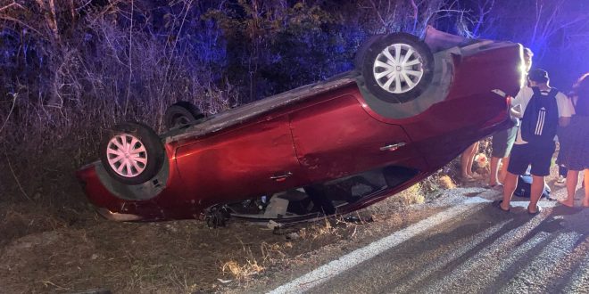 Kinchil, Yuc. a 19 de marzo 2025.- Una fuerte volcadura sufrió una familia que venía a bordo de un vehículo Nissan, cuando venían bajando del puerto de Celestún, la noche de anteayer.