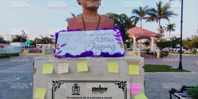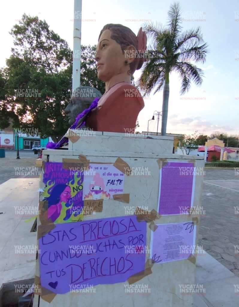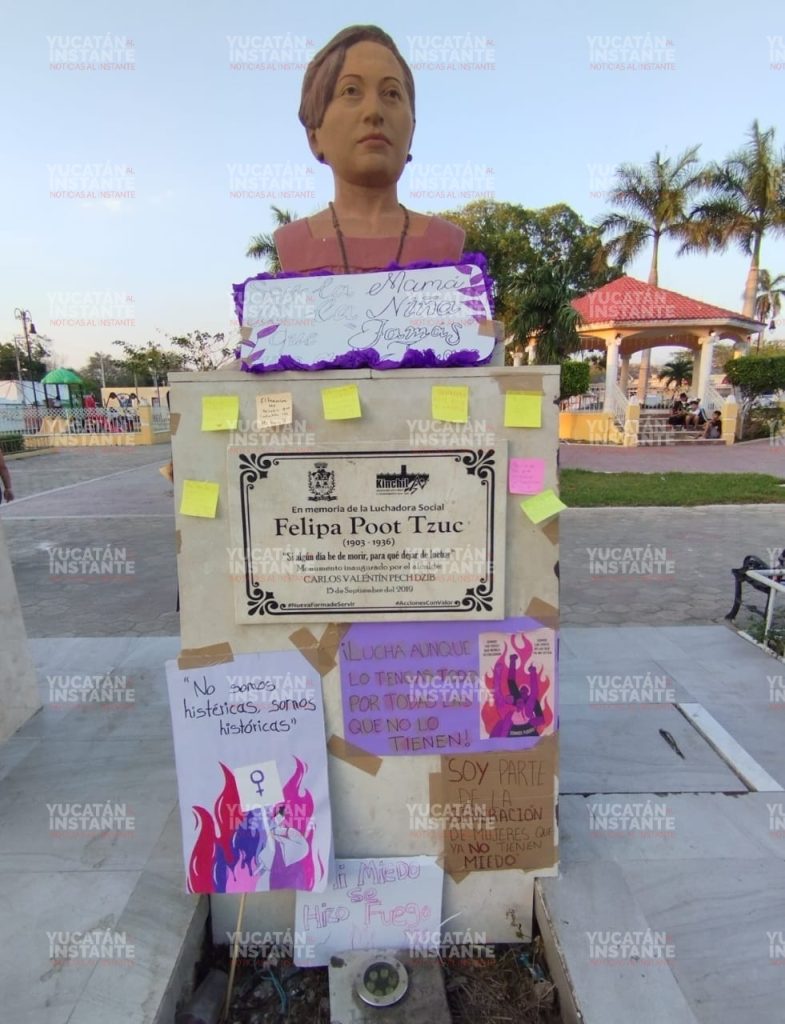 Bordearon el parque y luego se apostaron frente al Palacio Municipal, donde continuaron con sus porras. Posteriormente acudieron al busto de la lideresa maya Felipa Poot Tzuc, en el que pegaron sus cartulinas y hojas alusivas a este día especial, sin faltar pegatinas con frases contundentes a que se respeten los derechos de las mujeres.