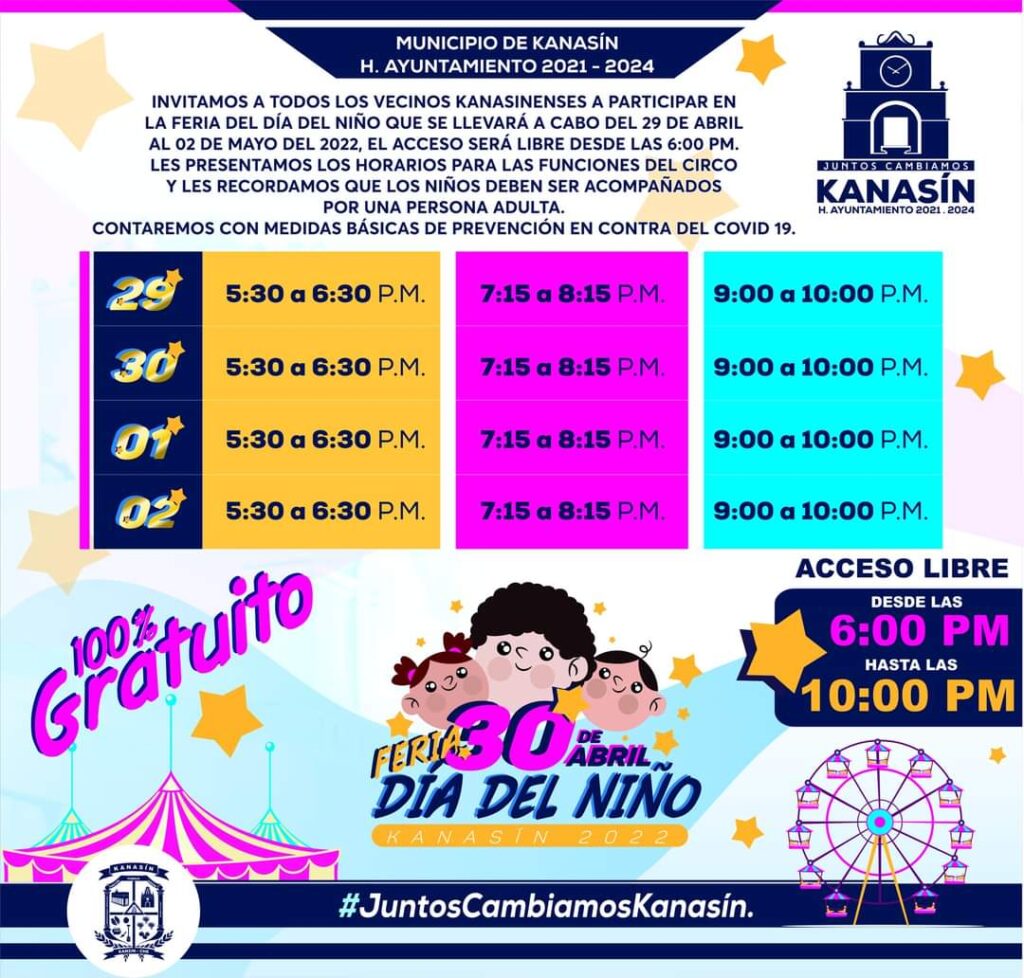 “Todas las funciones del circo y las atracciones de la feria serán totalmente gratuitas en apoyo de la economía de las familias de Kanasín y porque bien vale la pena que las niñas y niños festejen el 30 de abril”, señaló el edil kanasinense.