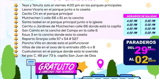 De igual manera, informó que en apoyo de las familias que viven alejadas del centro de Kanasín, se ha dispuesto de transporte gratuito en diversos puntos de algunas colonias y fraccionamientos: parque principal Centro, arque Mulchechén 1, parque Teya, parque Tehuitz, parque principal de Cecilio Chí, parque Leona Vicario, parque Santa Isabel, Capilla Cerritos Mulchechén, San Camilo en la cancha, cancha de Kaua III, Reparto Granjas en la calle 57 por 54, en el polifuncional de Francisco Villa, Villas del Oriente en el OXXO de la entrada, parque de la avenida en Cuauhtémoc y en la capilla San Juan de Diíos en Xelpac.