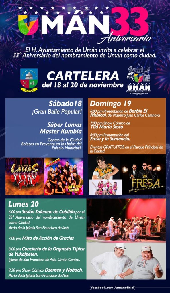 Umán, Yucatán a 17 de Noviembre de 2023.- El municipio de Umán celebra 33 años que fue nombrada como ciudad, es por ello, que tienen preparado diversas actividades que se realizarán del 18 al 20 de noviembre.