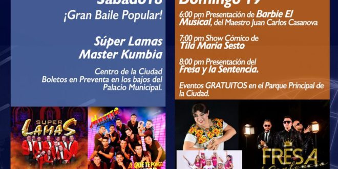 Domingo 19 se contará con la presentación de Barbie el Musical a las 6:00 pm, seguido del show cómico de Tila Maria Sesto a las 7:00 pm y al finalizar el Fresa y la Sentencia completamente gratis, la sede de estos eventos será la misma que el baile popular.